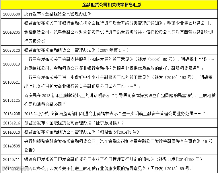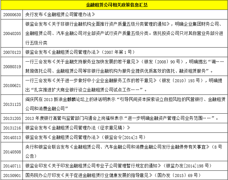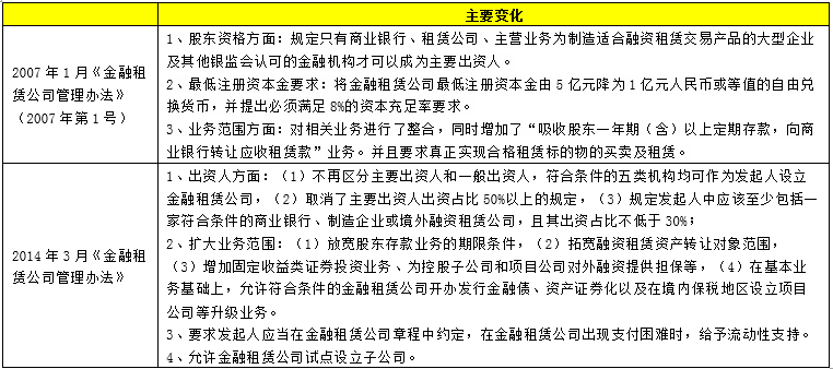 截止目前,关于金融租赁公司整体的监管政策主要有三个,一是2000年6月央行发布《金融租赁公司管理办法》,二是2007年1月银监会发布的《金融租赁公司管理办法》(2007年第1号),三是2014年3月银监会发布的银监会发布《金融租赁公司管理办法》(银监会令[2014]3号)。这三个政策文件实际上能够体现出监管政策导向上的一些变化。