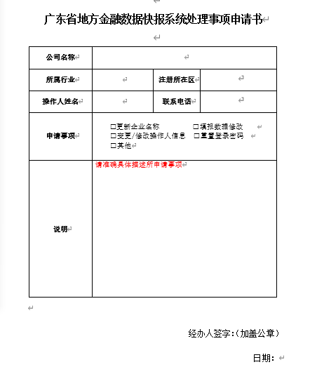企业填写各项必须信息真实、准确、完整。如快报系统内公司名称为曾用名或名称有误,请填写《广东省地方金融数据快报系统处理事项申请书》(见附件),加盖企业公章,于1月30日前发扫描件至sybl@shenzhen.gov.cn,由我局集中处理。