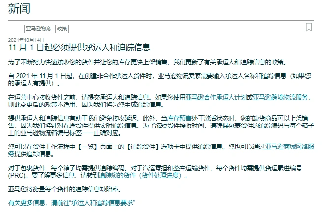 近日,亚马逊更新了有关承运人和追踪信息的政策,欧洲站自11月1日起生效。此前亚马逊美国站也宣布于10月1日起执行该新政策。