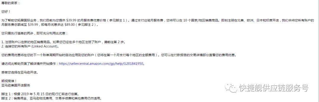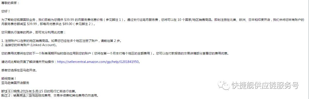 邮件明确指出:即刻注册在北美、欧洲、日本和印度开店,亚马逊会将收到邮件的卖家所有账户的月服务费总额减至 $39.99!