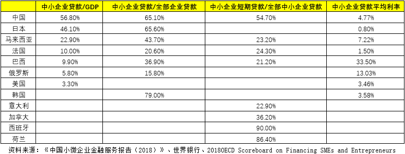 (2)这里我们还可以使用《中国小微企业金融服务报告(2018)》(央行发布)提供的数据进一步说明。具体来看我国中小企业贷款占GDP的比例达到56.80%,已经明显高于主要经济体;中小企业贷款占全部企业贷款的比例也和日本比较接近,并且远高于马来西亚、法国、巴西等经济体。