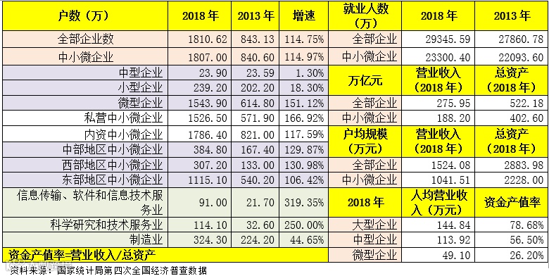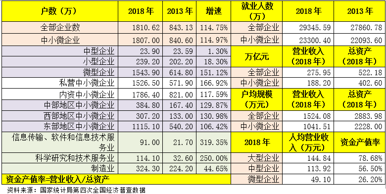 只有充分了解到我国中小微企业的实际情况和数据特征,才能更明白中小微企业所处的困境。这里使用第四次全国经济普查的数据(目前应该是最可靠、最权威的数据来源),我国中小微企业的数据特征如下:
