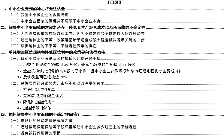 武汉疫情之下,源于三驾马车中消费需求的大幅下滑,市场对今年一季度中国经济增长开始担忧,而我们也相信2020年上半年的经济增速破6近5(一季度甚至有可能会破5)几乎是确定性事件。除此之外对不确定性风险抵御能力较弱的中小企业将要面临的生存窘境也颇让人忧虑,这主要是因为作为中小企业的主要载体,批发零售业、住宿餐饮业、旅游业等受疫情冲击最大的行业主要由中小企业构成,同时开工延迟以及民工延迟就业使得制造业也陷入进退两难的境地。