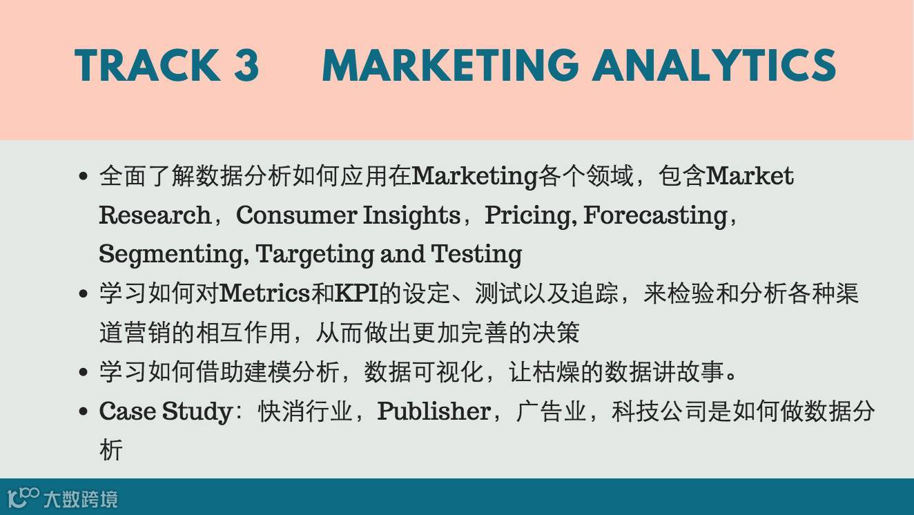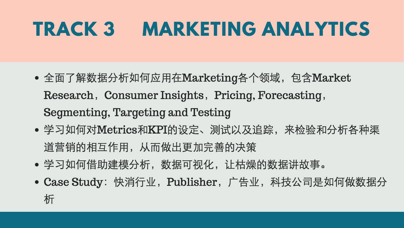 在学习了解Marketing行业整体之后,学员可以从Marketing职场入门,Digital Marketing和Marketing Analytics这三个track中,选择一个自己最感兴趣的track进行深度学习。每一个track都能在最短时间内,从知识框架(Fundamentals),必备技能(Skill set),到行业趋势发展(Trend)等多个板块帮你打通入行壁垒。