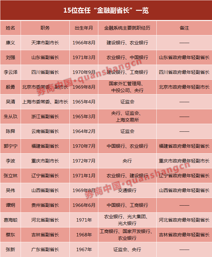 其中,曾长期在人民银行工作的李波出任重庆市副市长,建行副行长张立林调任辽宁省副省长,工行副行长谭炯任贵州省副省长,交行副行长吴伟出任山西省副省长,光大银行行长葛海蛟赴任河北省副省长,农行副行长蔡东被任命为吉林省副省长。