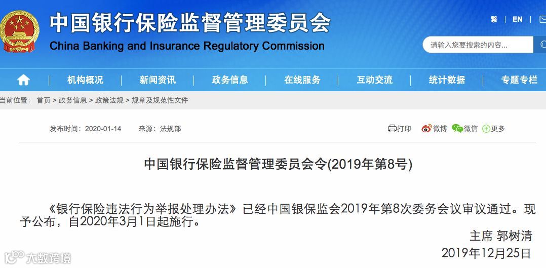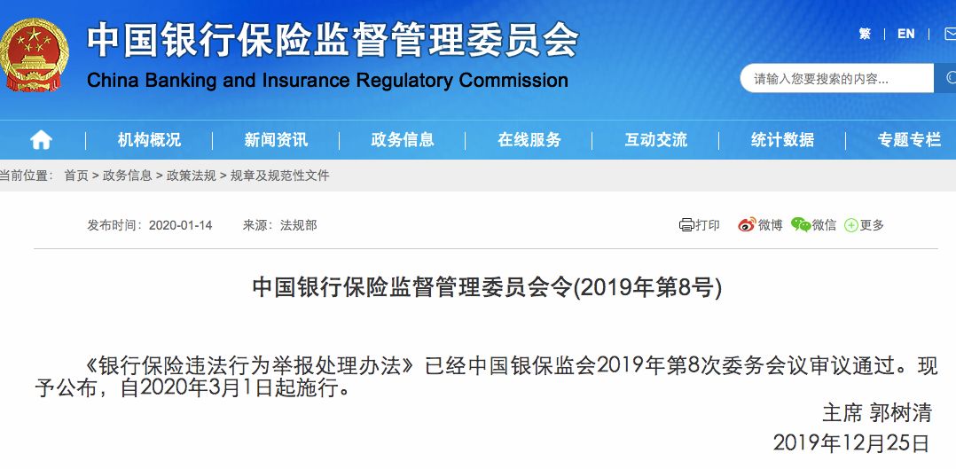 1月14日,银保监会印发《银行保险违法行为举报处理办法》(以下简称《办法》),银行保险监督管理机构应当在收到举报之日起15日内审查决定是否受理,并书面告知举报人。