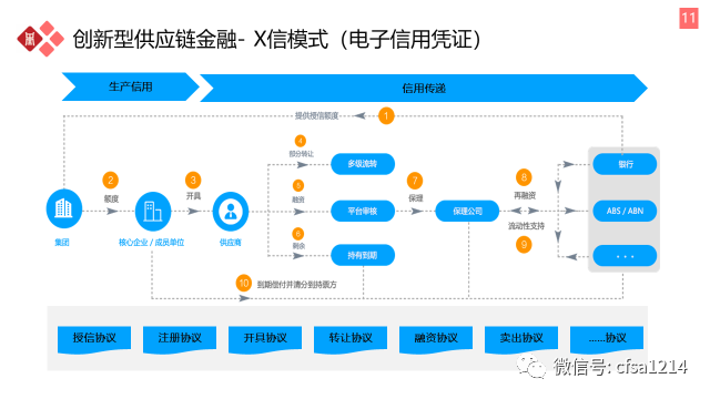 首先,“集团”是指大型核心企业,包括央企、大型国企、大型上市公司等都可以作为核心企业。核心企业通过银行获得授信后,将授信额度分配给企业内部成员单位,成员单位获得相应额度即可开具X信,当然每个平台都可独立命名;供应商收到X信后,如果不继续流转,账款到期日平台一定会还款;如果任何一级持有者需要对上级供应商进行支付账款,X信可以进行逐级转让,即债权转让;第三,任何一个持有方可以在平台发起融资,即反向保理业务。保理公司买入资产后,如果资金短缺,可将资产进一步卖出至金融机构,如银行、证券公司等,即再保理、ABS、ABN业务,这就是完整的基于X信模式的供应链金融场景的核心流程。核心企业集团内部单位一旦开具X信,到期刚性兑付,这就是信用。如果成员单位到期未还款,所属集团需为其垫款、代偿。目前市场上很多X信大家都较为青睐,该模式底层都具有系统化的协议支撑。
