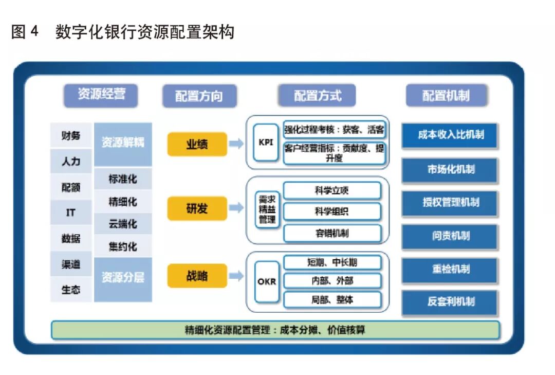 强化资源经营理念。当前银行普遍缺乏资源经营理念,资源的规范化管理不足,颗粒度不够细致,资源的流通和使用受到人为干涉,配置不足、重复配置、响应效率不高、浪费严重等问题突出,也难以据此建立有效的资源闭环管理机制。此外,数字化转型后,银行的资源范畴也进一步扩展,既有自有资源,也有来自合作渠道的资源,更加需要资源经营,提升协同配合能力。