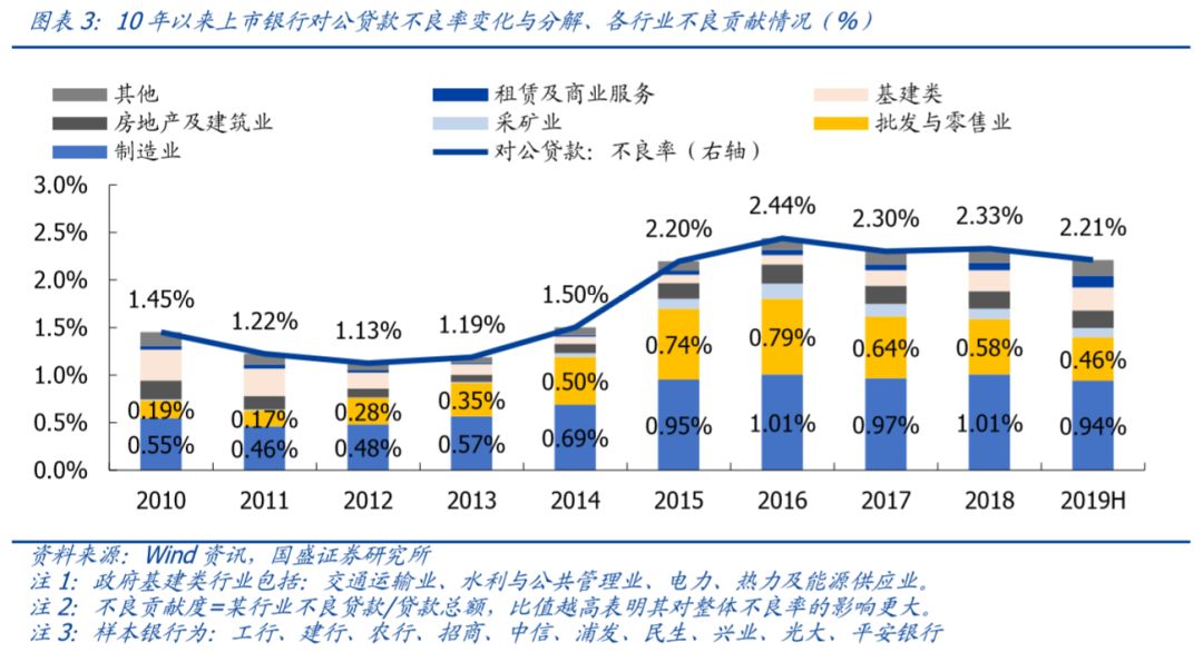 15年以来,银行业主动优化对公贷款结构,批发零售业、制造业贷款占比由14年的24%、11%,下降至19H仅17%、6%,而低风险的基建类贷款+租赁及商务服务业(含部分城投贷款,不良率仅0.91%)合计占比则从14年的35%提升至19H的45%。