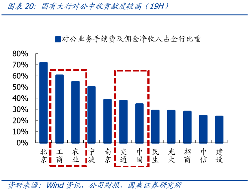 A.创造大量中收:国有大行对公业务所贡献的手续费及佣金净收入占全行的40%左右;