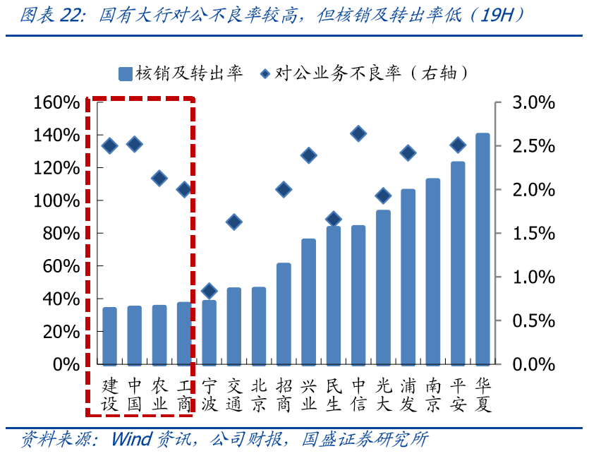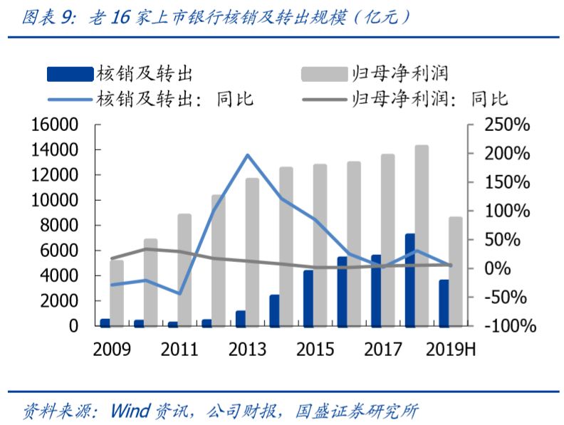 1)持续加大不良贷款的处置力度。16年以来,银行继续保持高强度的不良贷款核销及处置力度,累计核销及转出不良贷款金额2.2万亿,占利润总额(16-19H 累计)的44%;