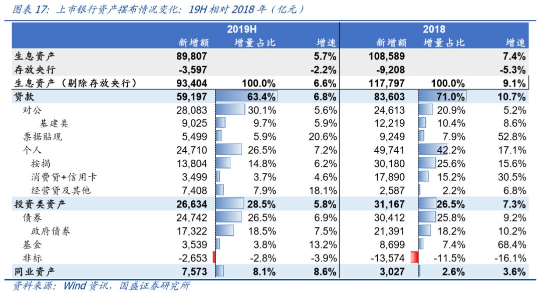 从上市银行的资产摆布来看,这一趋势更明显:19H上市银行贷款新增5.9万亿,增幅6.8%,其中对公贷款(不含贴现)增2.8万亿(+5.6%),已超去年全年,占新增信贷投放的47%,其中基建类是主要的投资方向,上半年相关贷款增加9000多亿,增速高出对公贷款整体0.3pc,与此同时非信贷资产中,政府类债券(包括国债、地方政府债)增持1.7万亿,占新增投资类资产的65%。