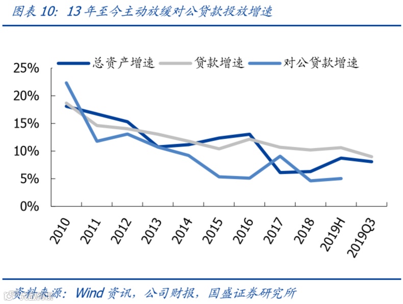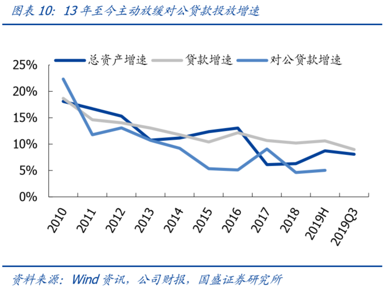 15年后,随着监管趋严+MPA考核体系的建立,行业规模扩张明显放缓,其中对公贷款增速从15年之前10%左右骤降至当前在5%左右,其背后是银行“痛定思痛”,加大风控门槛的同时压降存量风险,商业模式正逐步转化为“内源式”、“高质量”发展。
