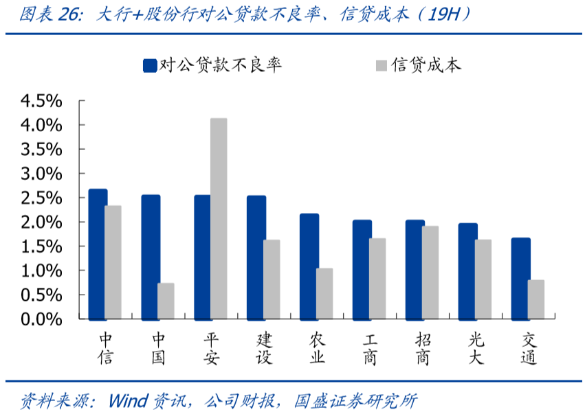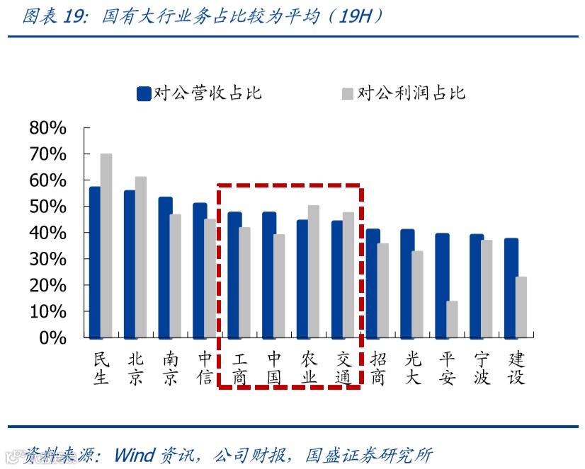1)国有大行优质项目资源丰富,对公占比整体较高。信贷角度看,19H国有大行对公贷款比重较高(整体在60%以上),其中基建+租赁商务服务业占贷款总额的30%左右。投资资产角度看,其政府类债券(国债、地方政府专项债等,国债无法单独剔除)占比整体在15%以上。