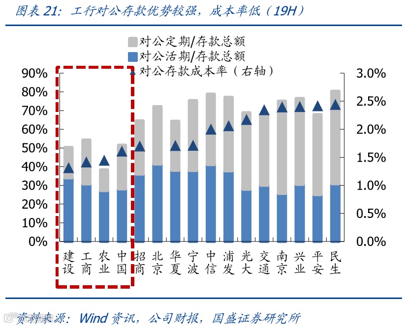 2)存款沉淀能力强,虽然没有披露对公存款成本率的情况,但其19H对公活期存款占比高达57.4%,明显高于同业;