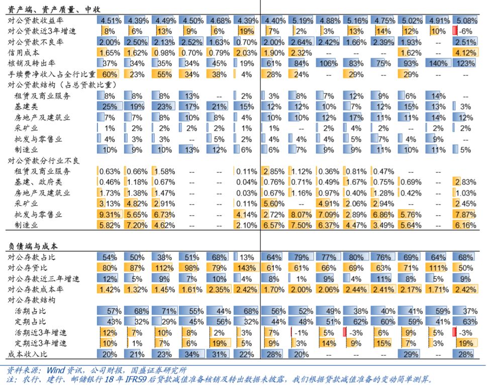 其中工商银行对公业务占比较高,对公贷款占比达61%,其中基建类+租赁商务服务业贷款占总资产比重达33%,为国有大行最高,此外其投资端也持续增配政府类债券,到19H占总资产比重达16%。