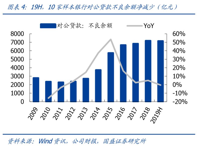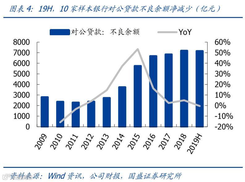 1)总量上看,行业对公不良余额17年以来基本“止增”,19H实现净减少。10家样本银行数据来看,10年以来对公不良贷款增速持续提升到15年最高达53%,此后持续回落。17年以来已连续3年增速不超过5%,19H则首次实现对公不良余额“净减少”。