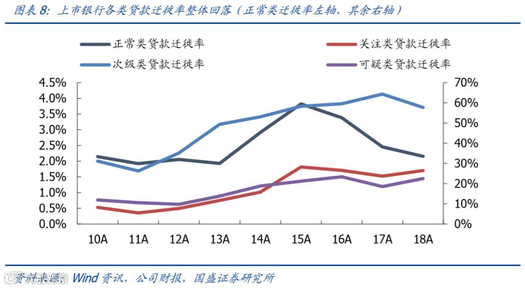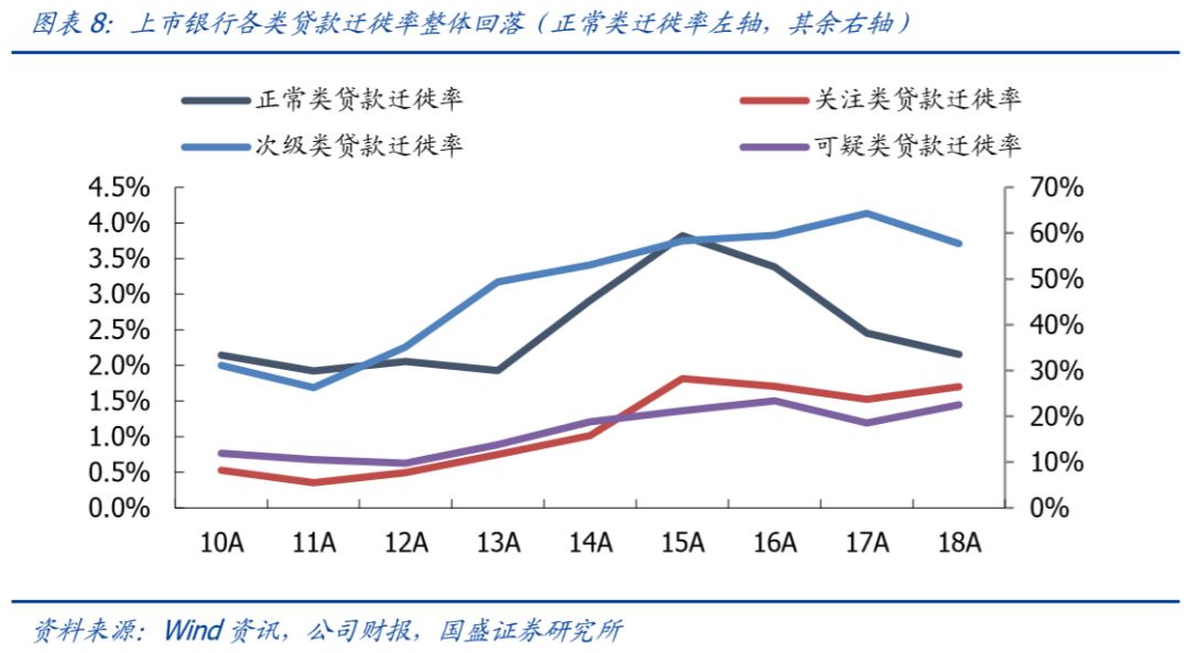 5)动态来看,各迁徙率指向存量包袱大幅减轻。在不良认定不断趋严的政策引导下,目前各项指标还在波动,关注类贷款迁徙率(26.5%)、可疑类贷款迁徙率(22.5%)继续保持稳定,但正常类,次级类的迁徙率已出现见顶回落迹象,其中正常类贷款迁徙率已降低至14年以来的新低(2.15%),回归10-14年2%左右的正常水平。目前银行的不良率水平越来越真实、且暴露愈发充分,资产质量指标的可信度不断提升。