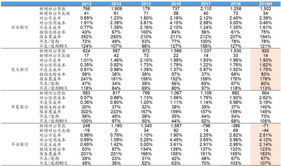 2、资产质量包袱大幅减轻。在不良贷款认定不断趋于严格的情况下,银行(10家样本行)对公贷款的不良率下降至2.21%,且截止2019年中报,首次出现对公贷款的不良余额净减少。银行在减轻资产质量的包袱上做了非常多的努力: