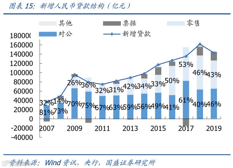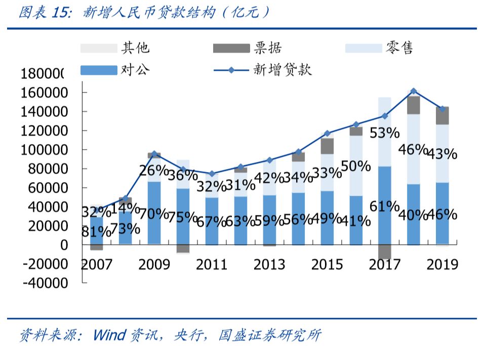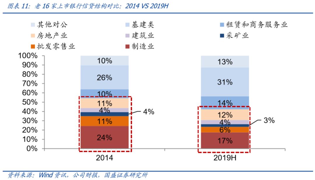 上市银行这一趋势更明显,19年上半年对公贷款净增2.8万亿,超过零售贷款的2.4万亿,更是已超去年全年增量(2.5万亿),其中基建类、租赁及商务服务业是主要的投资方向;政府类债券也增持1.7万亿。