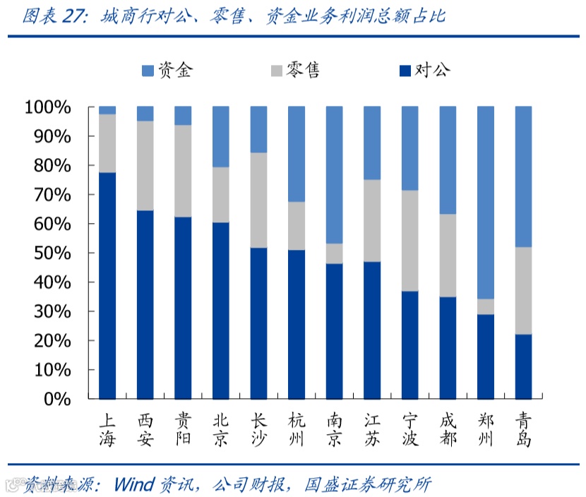 国有大行体量较大,对公、零售业务均为他们“均衡发展”的一环,战略层面主要强调资源在对公、零售、金融市场之间均衡调配,业绩贡献的角度看,其对公业务营收、利润的贡献度在45%左右,较为均衡。