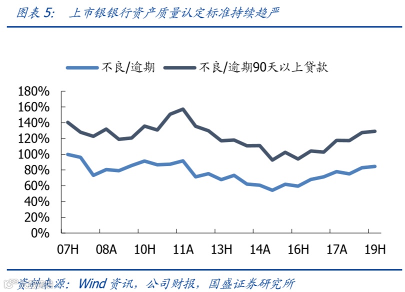 4)不良认定标准不断提升,当前行业整体的资产质量已基本上是14年以来最“扎实、干净”的状态。监管引导下,上市银行已逐步将逾期90天以上贷款全部纳入不良,并按照不良贷款的要求提足了减值准备,19H上市银行不良/逾期贷款、不良/逾期90天以上贷款比例已提升至84.5%、129%,为14年以来最高水平。