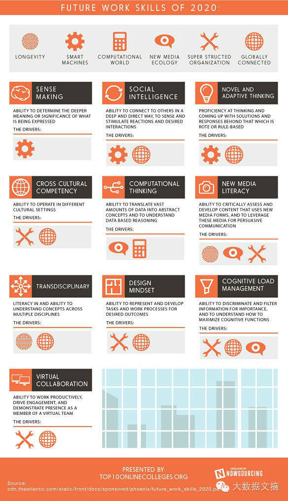 在这 6 大驱动力的作用下,未来学会总结出的 2020 年 10 大工作技能是: