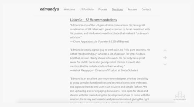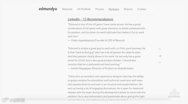 借他人之嘴来反映你的优势其实很符合现如今这个互联网时代。在作品集当中,将用户对你的反馈、嘉奖,甚至推荐呈现出来,是对你的设计能力的肯定,也是你能力的明证。