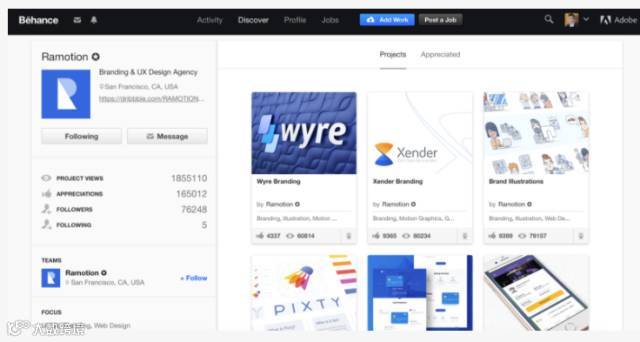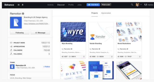 Behance 是目前最有影响力的设计师作品展示平台,许多公司都将它作为重要的参考。我最喜欢的是 Ramotion 的作品集,他们的每一个作品几乎都是精品,并且受到业界极大的关注。