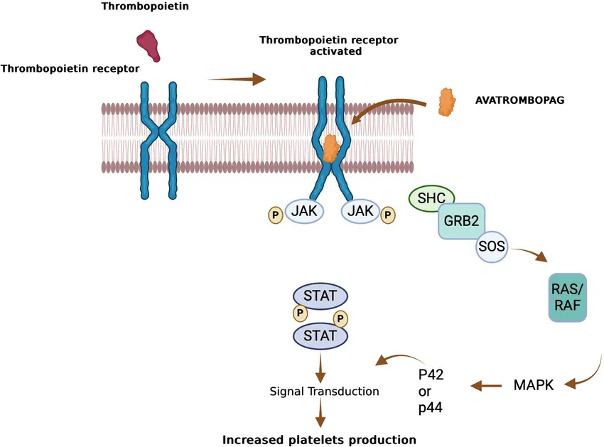 阿伐曲泊帕通过选择性激活血小板生成素(TPO)受体,刺激骨髓中巨核细胞的增殖和分化,从而增加血小板的生成。与内源性的TPO相比,阿伐曲泊帕具有更高的亲和力,能够更有效地促进血小板的生成。