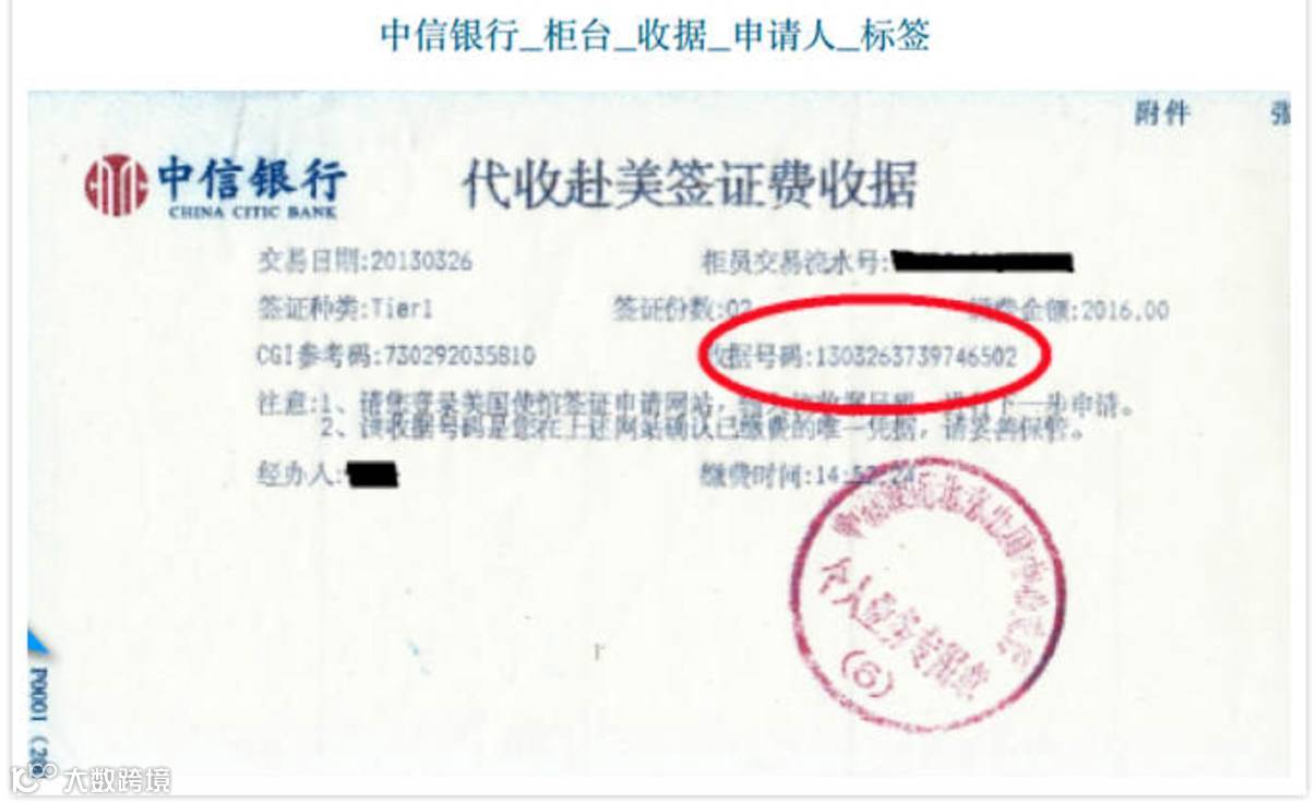 3.缴费收据:缴费后,中信银行给的缴费收据。有两张,先把两张收据拿胶水粘起来,然后贴在ds-160确认信下方的空白处,注意不要把下放左侧的条形码挡住了。