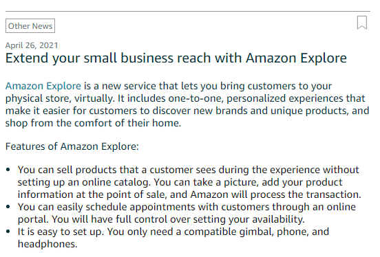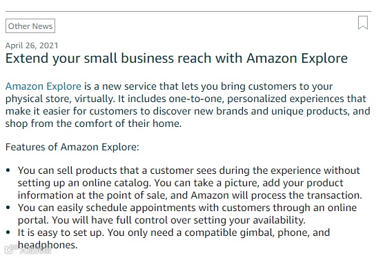 此外,亚马逊近日还宣布将会为Amazon Explore服务提供免费试用一次和设备优惠计划,时间是截止至7月1日为止。Amazon Explore其实本质上是一个旅行服务,通过直播的方式,顺带卖货。卖家们正好可以试用这一新的计划。