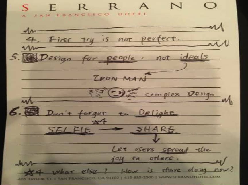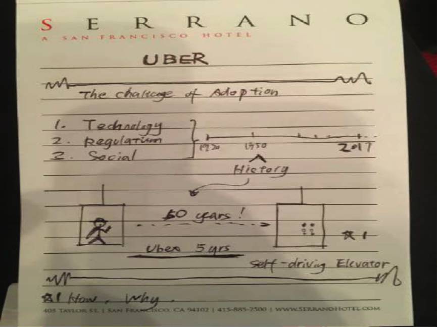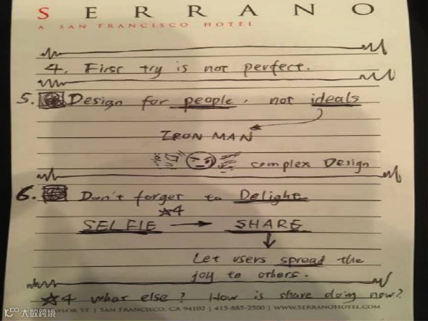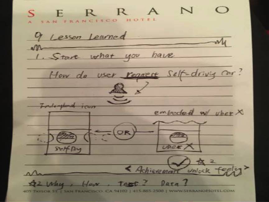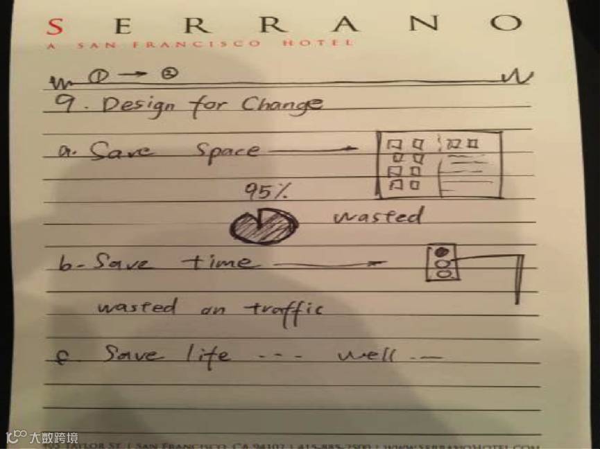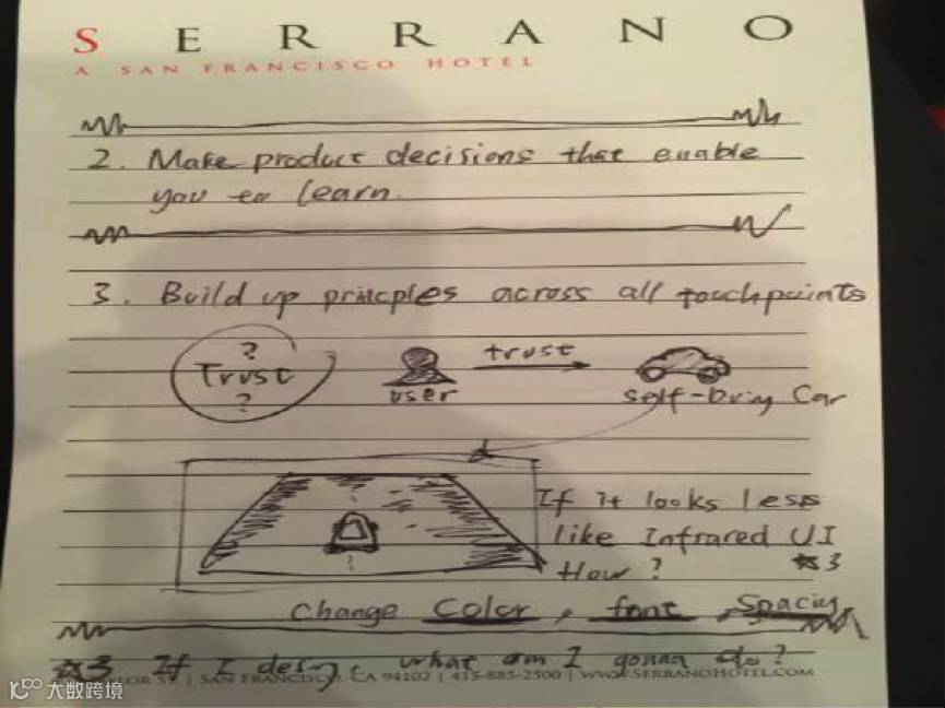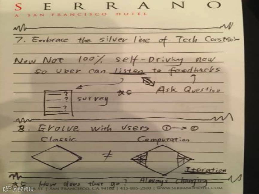 Uber对新技术的应用有非常的开放的心态,最大体会是他们一切的设计都是真真正正从用户出发,而非从技术立面出发。他们不断探索多种可以减少⽤户对⽆人⻋的顾虑和担心的设计。这位Uber Senior Designer分享了Uber从拥抱⽆人⻋技术中学习到的9个经验,点燃全场。 下面就为大家一一分享,文末还有一些现场手绘笔记,以及我如何利⽤简单视觉化手绘化处理笔记,让辅助记录帮助⾃己思考。