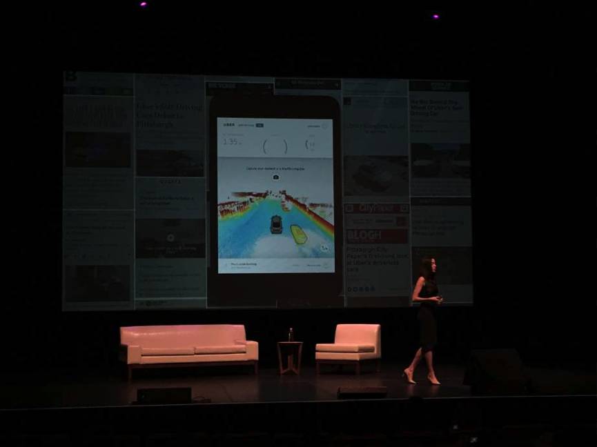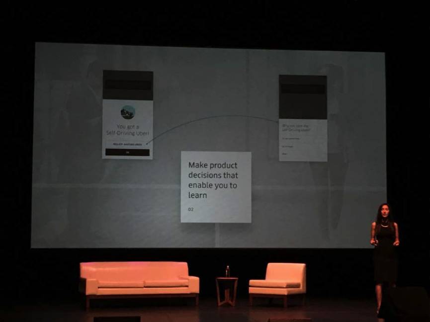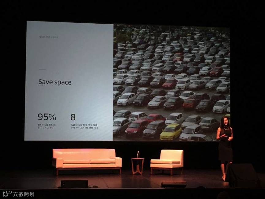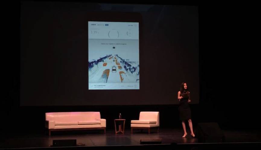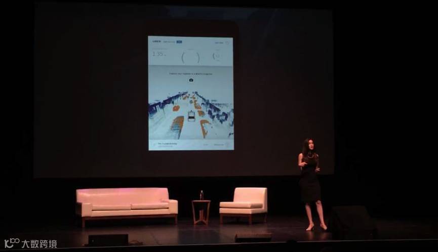 演讲⼈Molly向我们展示了他们在设计层⽅方⾯面,如何让叫车的乘客知道现在有Uber⽆⼈车可选择。