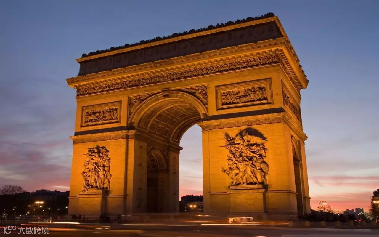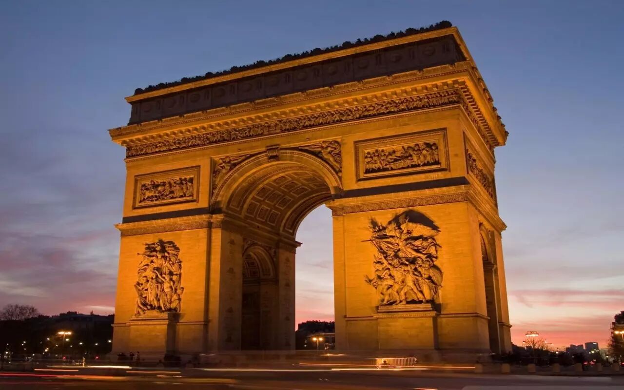 F.凯旋门——是巴黎市的四大代表建筑之一(埃菲尔铁塔、凯旋门、卢浮宫和巴黎圣母院),也是目前香榭丽舍大街上最大的一座圆拱门。是为了纪念拿破仑在1806年在奥斯特尔里茨战役中获胜而建的。