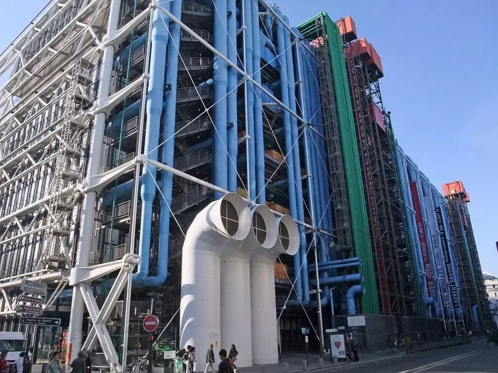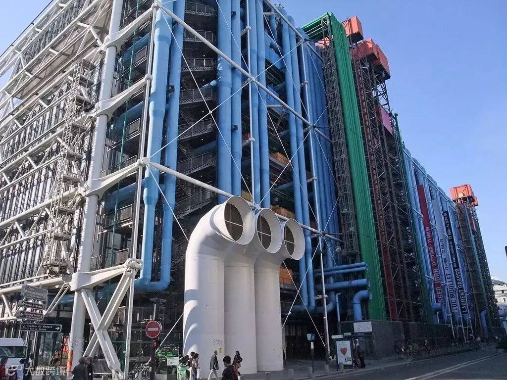 D.蓬皮杜国家文化艺术中心——是法国20世纪文化艺术的集中展示场所,与卢浮宫、奥赛博物馆并称为巴黎三大艺术博物馆。现在,蓬皮杜文化中心已不仅仅是一个文化中心,已经成为巴黎又一大名胜。建造这座文化艺术中心是乔治蓬皮杜总统的创意,现代感的外观这个庞然大物由钢管和玻璃管构成,外墙布满五颜六色的管线和钢铁桁架:蓝色是空调排气系统、黄色是电力系统、绿色管道控制水管。