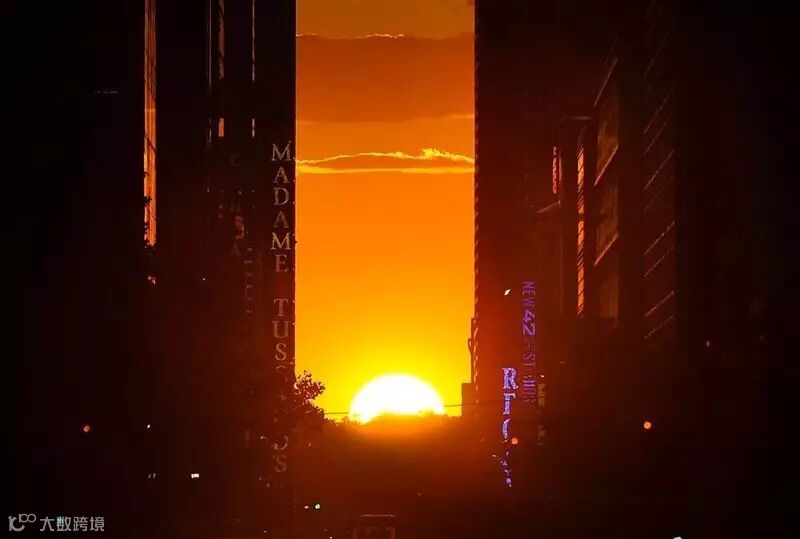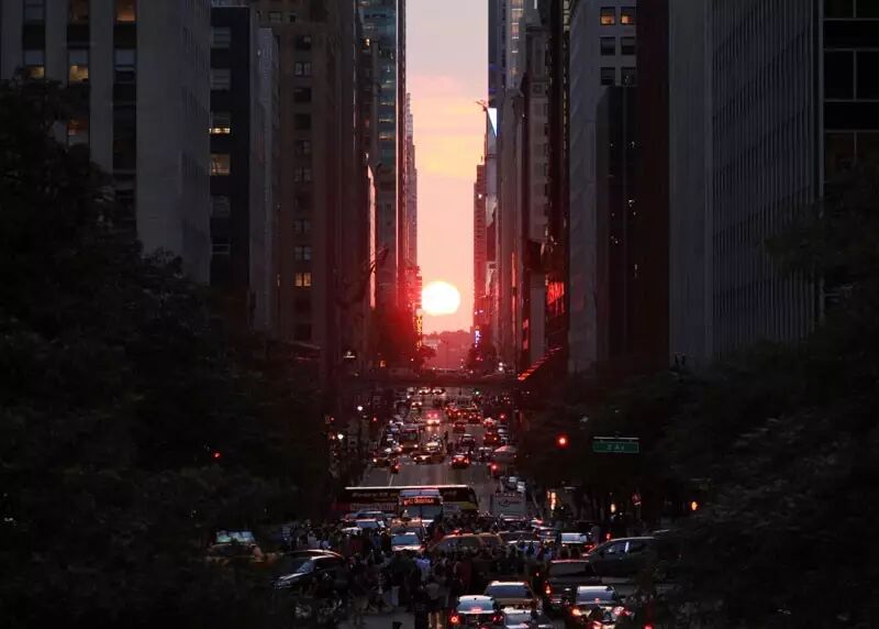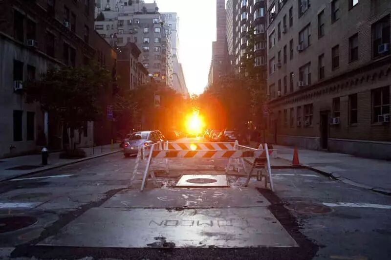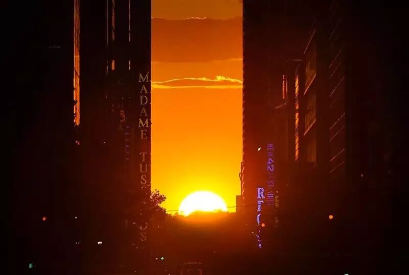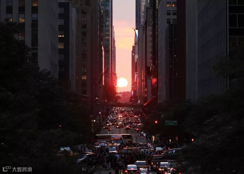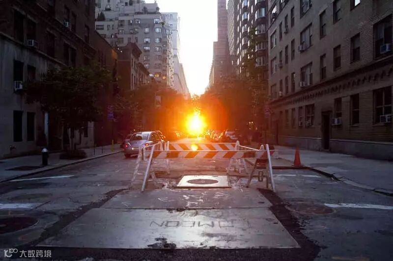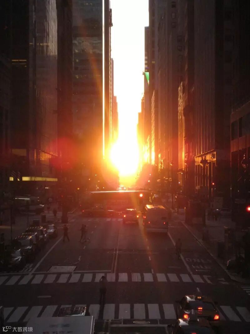 如果你还不太清楚什么是曼哈顿悬日,这里先简单介绍一下。它就是一个不普通的夕阳。特别在哪里?是因为夕阳时,刚好与曼哈顿棋盘式的街道吻合,让它出现在东西向街道西边的尽头,而这个景观一年就两次机会。人们在这些街道上,由东往西望去,穿过两排摩天大楼所形成的夹缝,就可以见到这绝无仅有的曼哈顿悬日奇观!