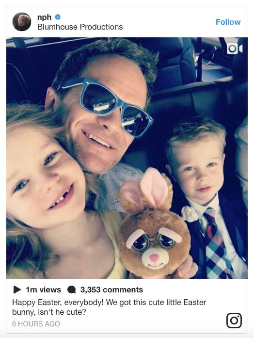 新电影《蓝精灵2》刚上映的Neil Patrick Harris也是个陪娃过节的好父亲。只是你给孩子们买的 "cute little Easter bunny"这迷之表情真是一言难尽呐。