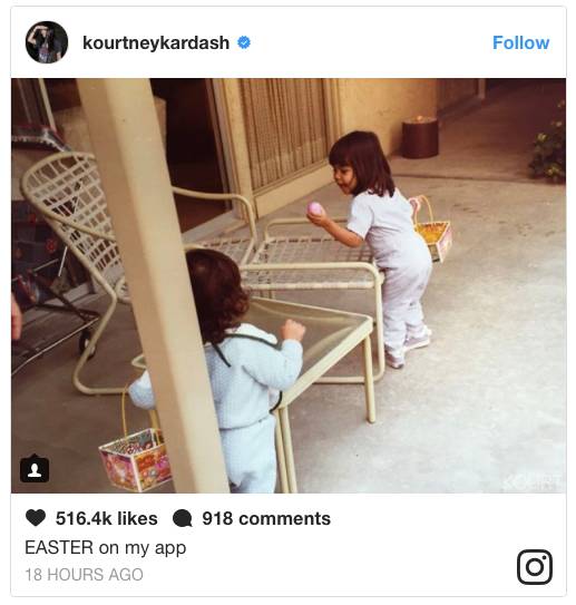 欢庆传统节日,也总能让人回忆起许多年前的今天,幼年的自己是如何度过的。Kourtney Kardashian贴出了小时候的自己和妹妹Kim结伴搜集彩蛋的一幕。