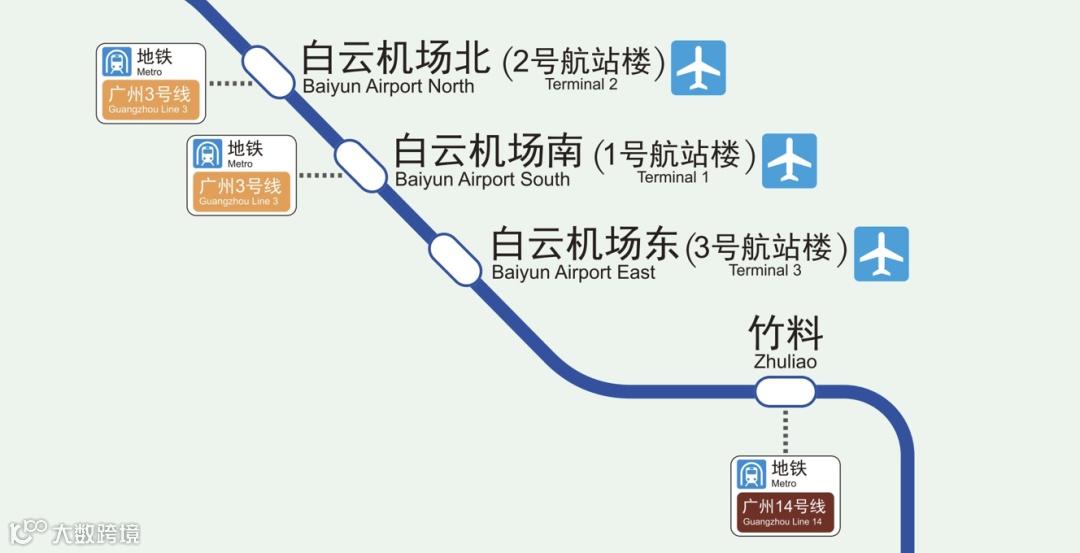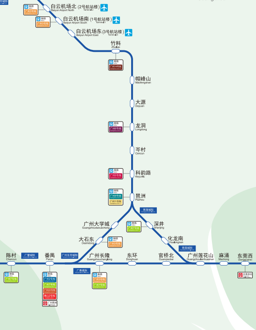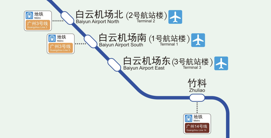 白云机场东站、白云机场南站、白云机场北站:可直接到达广州白云国际机场的不同航站楼,便于乘坐飞机前往各地。对应关系分别为:白云机场东(3号航站楼)、白云机场南(1号航站楼)、白云机场北(2号航站楼)。