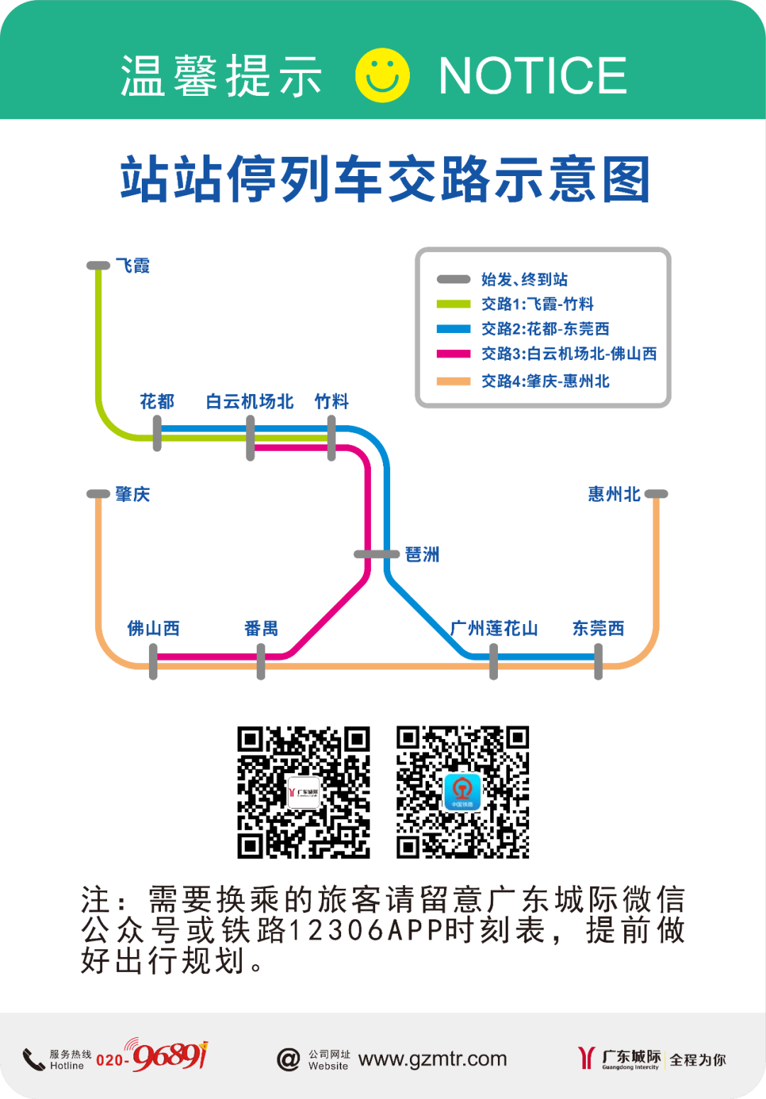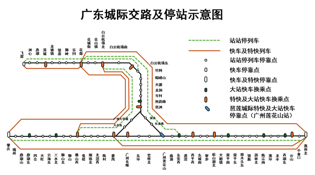 目前,广东城际全天开行“飞霞-竹料”“花都-东莞西”“白云机场北-佛山西”“肇庆-惠州北”等四条“站站停”交路,以及“(清远)飞霞-花都”“花都-肇庆”“花都-惠州北” “白云机场北-佛山西”“肇庆-惠州北”“番禺-惠州北”等六条大站快车、特快列车交路。