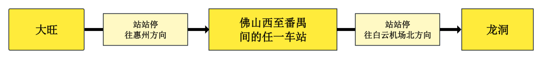 👉示例:大旺站→龙洞站,可以先乘坐往惠州方向“站站停”列车到佛山西站至番禺站间的任一车站,再换乘往白云机场北方向的列车到达。