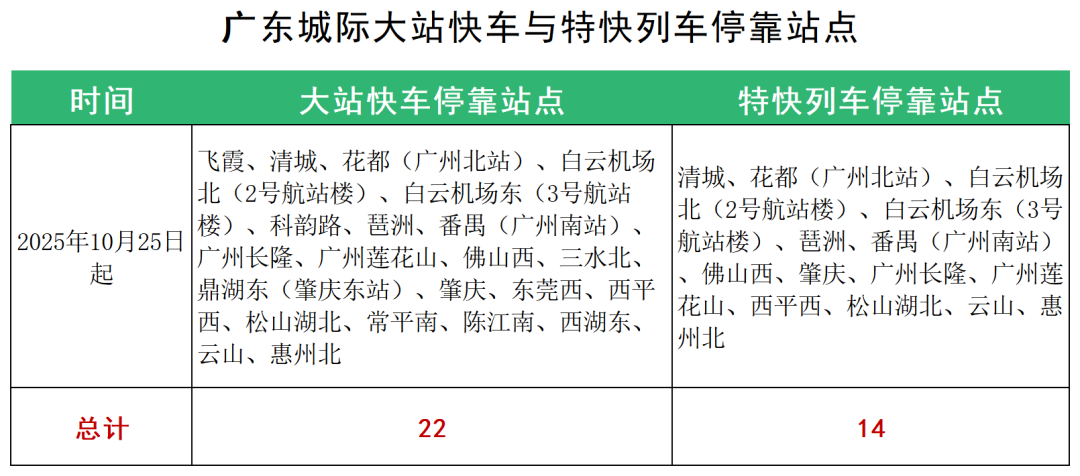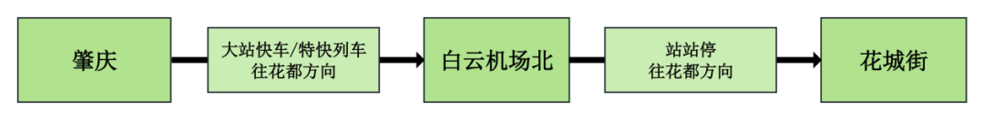 👉示例:肇庆站→花城街站,可以先坐往花都方向的“大站快车”或“特快列车”到白云机场北站,再换乘花都方向“站站停”到达花城街。