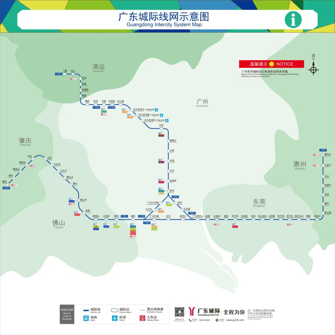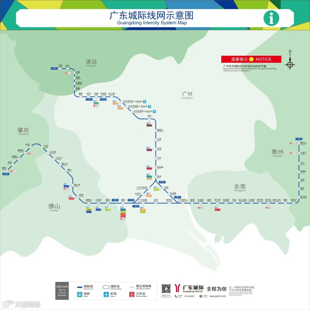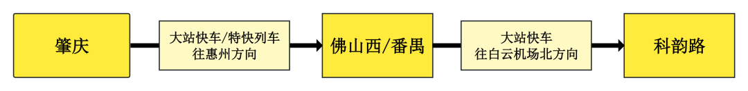 👉示例:肇庆站→科韵路站,可乘坐往惠州方向的“大站快车”或“特快列车”到佛山西站或番禺站,再换乘往白云机场北方向的“大站快车”。