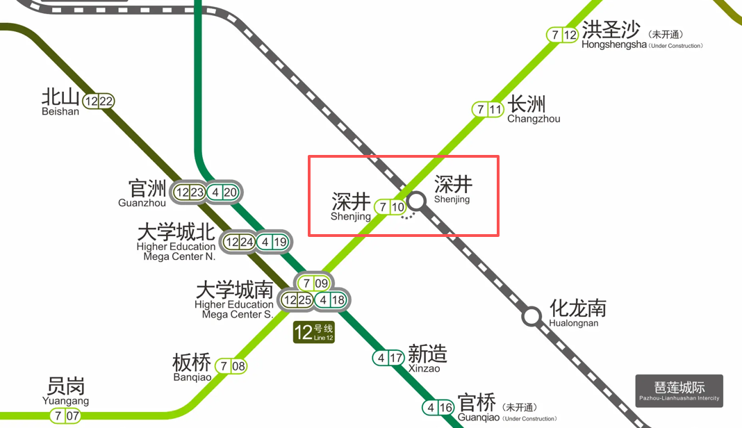 ▲从东莞方向前往大学城,可在深井站换乘地铁(图源:广州地铁)