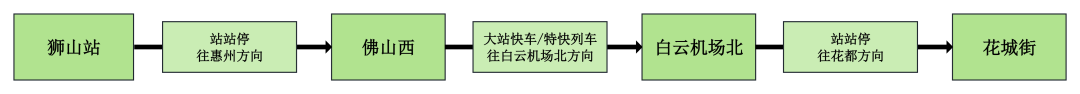 👉示例:狮山站→花城街站,可先乘坐往惠州方向“站站停”至佛山西站,再换乘往白云机场北方向的“大站快车”或“特快列车”到白云机场北站,再换乘开往花都方向的“站站停”到达花城街站。