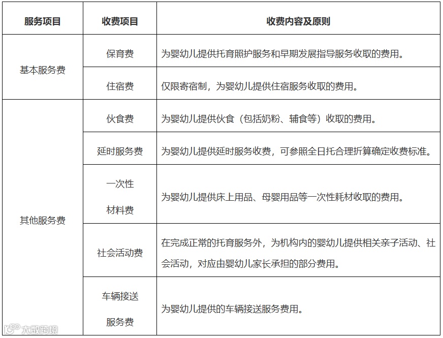 在收费管理方面,《通知》明确普惠托育服务机构收费包括基本服务费和其他服务费。其中,基本服务费包括保育费、住宿费(仅限寄宿制);其他服务费指在基本服务费外,服务机构收取或代收的伙食费、材料费等其他费用。