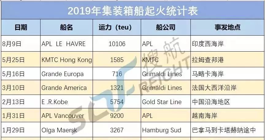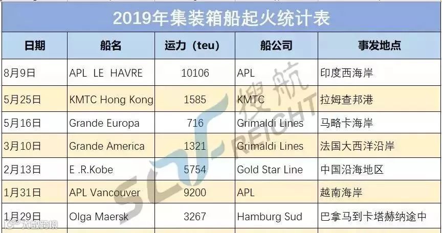 上个月《集装箱洞察》周刊上公布了今年1月3日-8月9日期间就已经发生了8起集装箱和滚装船舶失火事件!船只运力从700teu跨越至一万多teu!