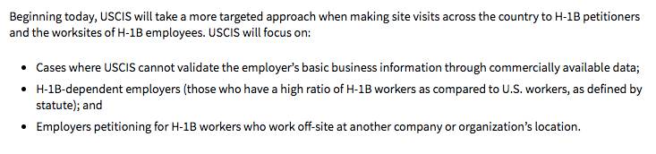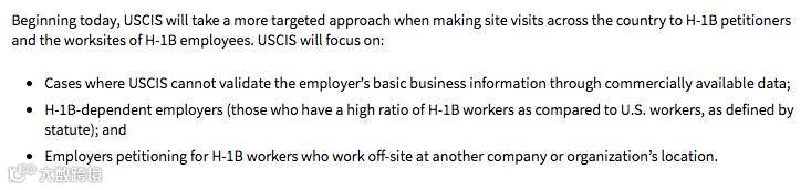 虽然川普目前提出的所有关于移民的新议案,均没有被参议院或者众议院正式通过,但移民局的确响应了川普并更改了某些H1B政策。继上个月暂停加急处理(premium processing),USCIS在开放接受申请的当天,宣布将进一步对H1B进行严查审核。从今天起,移民局将对全美申请H1B的公司和申请者工作地点进行实地查访(site visits),此次审查具有针对性,侧重范围包括: