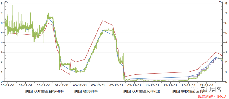3、2019年以后,美联储重新进入降息周期,并于8月1日与9月19日分别下调基准利率25个BP至1.75-2%的区间内。